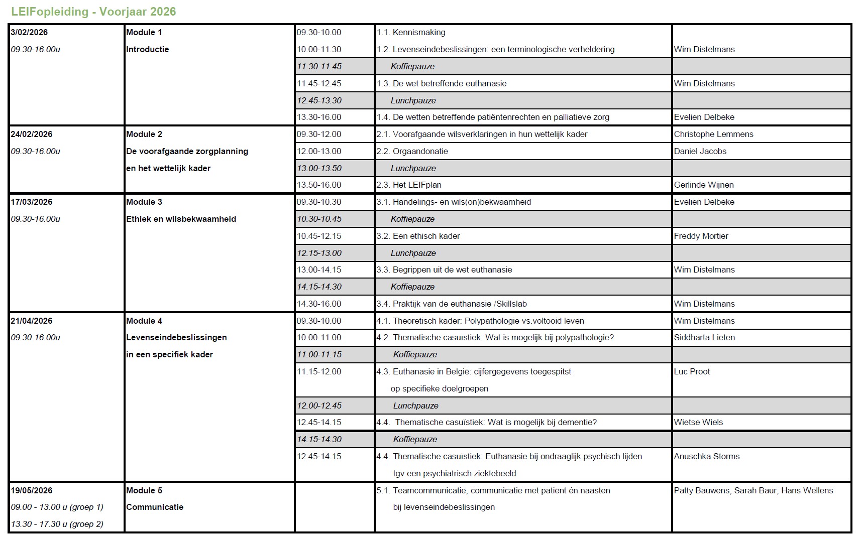 Verpleegkundigen en andere zorgverleners (psychologen, maatschappelijk werkers, moreel consulenten, pastores, kinesisten,…) hebben behoefte aan opleiding over de beslissingen bij het levenseinde.