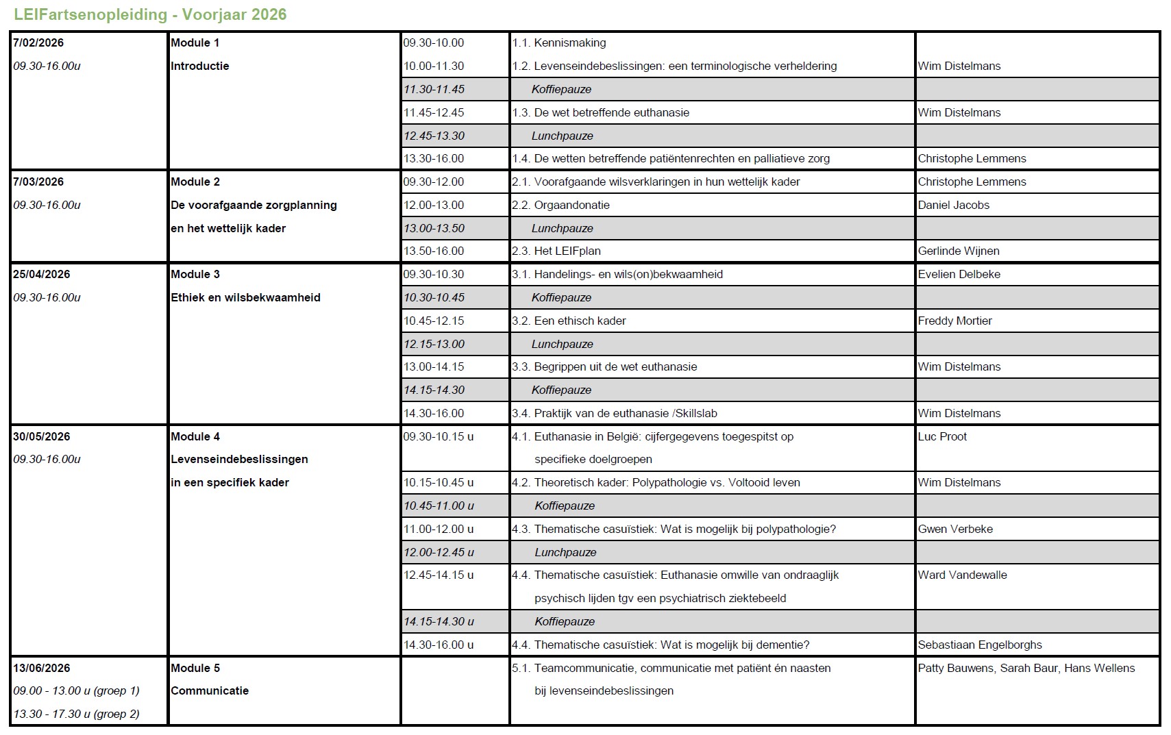 De opleiding van de LEIFartsen omvat alle aspecten die in betrekking staan tot het levenseinde. Zowel de palliatieve mogelijkheden als de wettelijke en praktische aspecten van euthanasie worden toegelicht.